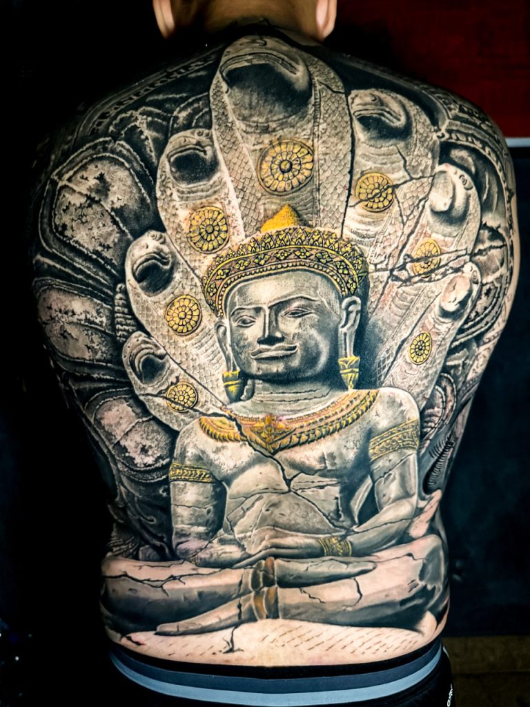SIEM REAP, CAMBODIA — In the heart of the ancient Khmer Empire, spirituality and science were never far apart. Among the most revered figures from this era is Bhaisajyaguru, known as the “Medicine Buddha” or (Khmer: ព្រះអង្គ ប្រកនាគ) Preah Ang Brok Neak. Today, we explore the profound history and the stunning artistic evolution of this deity, specifically focusing on the Angkorian style characterized by stone textures and exquisite gold-accented jewelry.