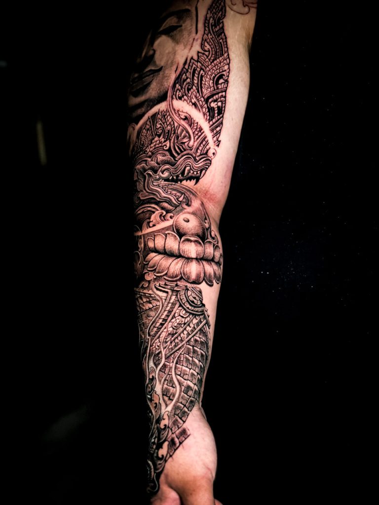 In the world of Khmer body art, a full-sleeve tattoo is more than just a decorative piece; it is a sacred narrative etched into the skin. Our latest featured masterpiece at Cambodia Ink brings together three powerful pillars of Khmer mythology and spiritual belief: Brahmā (ព្រះព្រហ្ម), the Khmer Naga (នាគខ្មែរ), and Rahu (រាហ៊ូ).