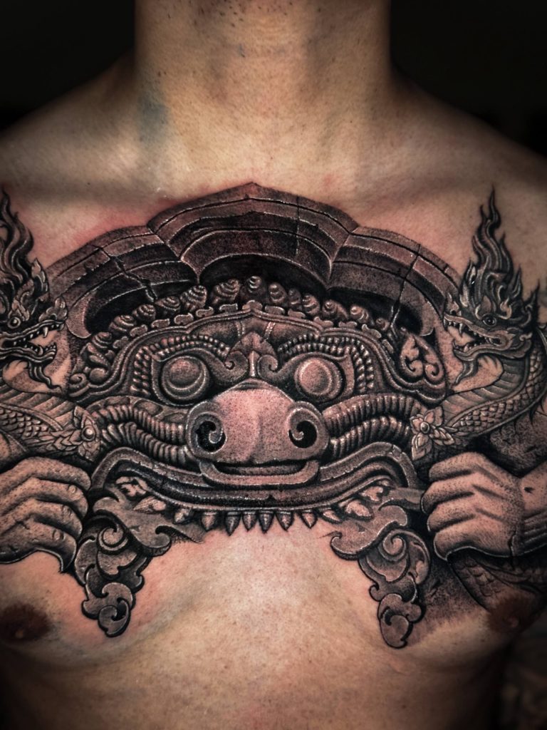 PHNOM PENH, CAMBODIA – October 1, 2025 – Cambodia Ink, a premier studio dedicated to the preservation and evolution of traditional Khmer art, is proud to announce the completion of a breathtaking new chest piece titled “Reahu Chap Haek Neak” (រាហ៊ូចាប់ហែកនាគ), which translates to “Reahu Tears the Naga.” This custom-designed tattoo, a powerful depiction of ancient Khmer mythology, was created for client Knite Huot of Boston, USA.